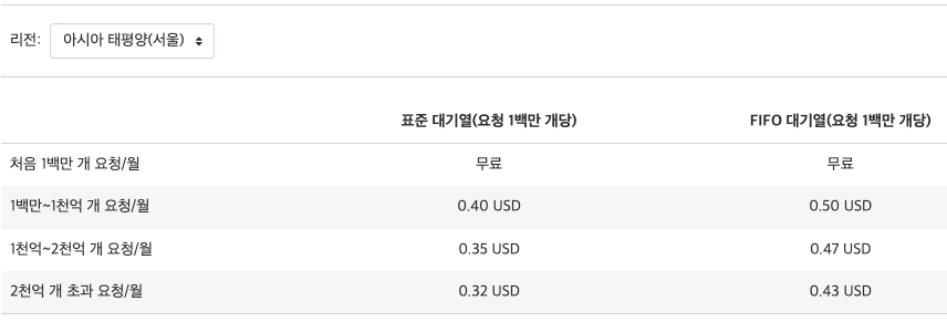 - 요금 부과 기준 : 큐에 보관된 메시지 수, 메시지 크기, 메시지 횟수 들에 따라 청구