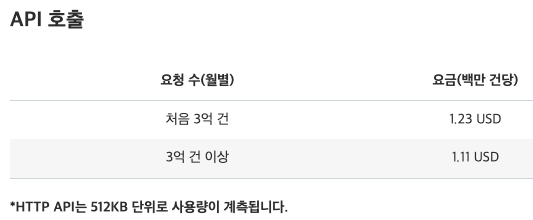 - 요금 : 최대 12개월 동안 무료 티어 (매달 1백만 HTTP API 호출, 1백만 REST API 호출, 1백만 메시지, 연결 시간 750,000 무료 제공)를 포함하여 사용량에 따라 청구