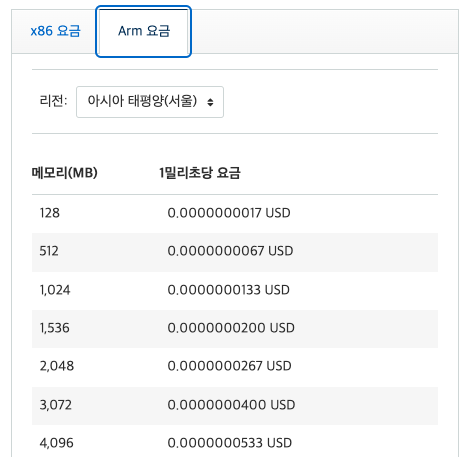 - 매달 요청 수에 대해 $0.20/백만 요청, 함수 실행 시간에 대해 $0.00001667/GB-초의 가격이 부과